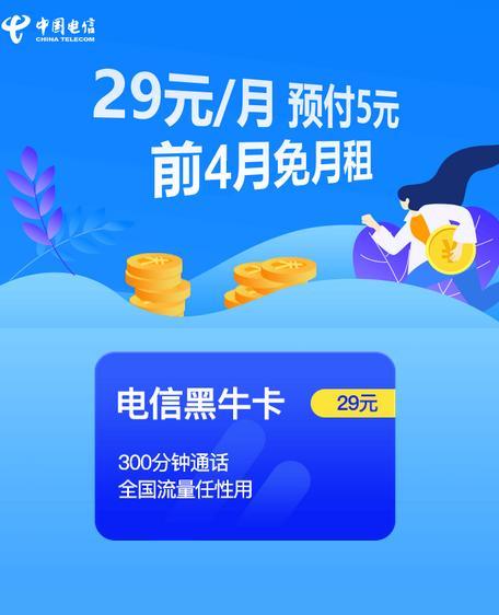 中国电信推出黑牛卡套餐,月租29元,内含300分钟通话+100G流量,全国流量任性用。首月免月租,第2~4个月每月到账29元,相当于前4个月免月租。
